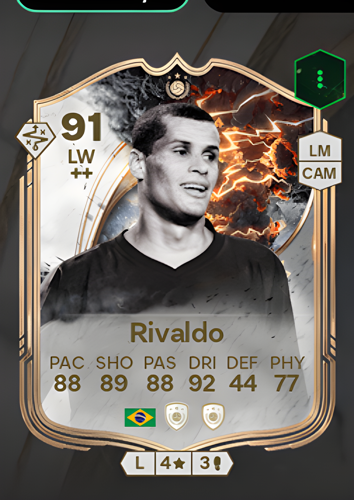 Introducing Rivaldo Vítor Borba Ferreira's Icon card, a formidable Left Wing boasting an overall rating of 91. With exceptional attributes including a blistering 88 pace, clinical 89 shooting, precise 88 passing, and mesmerizing 92 dribbling, he embodies elite attacking prowess. As a winger, his sharp skills allow him to swiftly dismantle opposing defenses, creating and seizing goal-scoring opportunities to decisively influence the game's outcome.